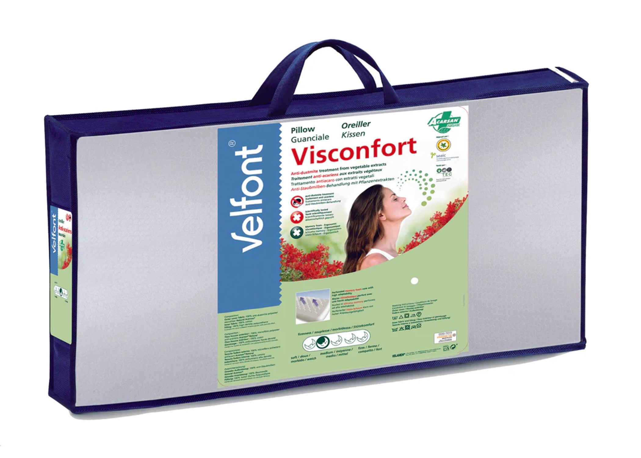 وسادة فيلفونت فيسكوكونفورت اللزجة المقاومة لعث الغبار، وسادة مريحة ومرممة، مصممة لمن يعانون من حساسية عث الغبار ويبحثون عن نوم صحي. تتميز ببطانة ناعمة من اللزجة وغطاء قطني معالج بمادة أكارسان الطبيعية، وهي معالجة مختبرة علميًا مضادة لعث الغبار، تتميز بفعالية مقاومة للغسل. غطاء الوسادة ذو السحاب المزدوج مصنوع من ألياف دقيقة فائقة النعومة، ويتميز بتصميم منقوش لسهولة الإزالة والصيانة. تتكيف الوسادة بشكل مثالي مع الرأس والرقبة بفضل حشوتها المصنوعة من البولي يوريثان اللزجة عالية الكثافة.