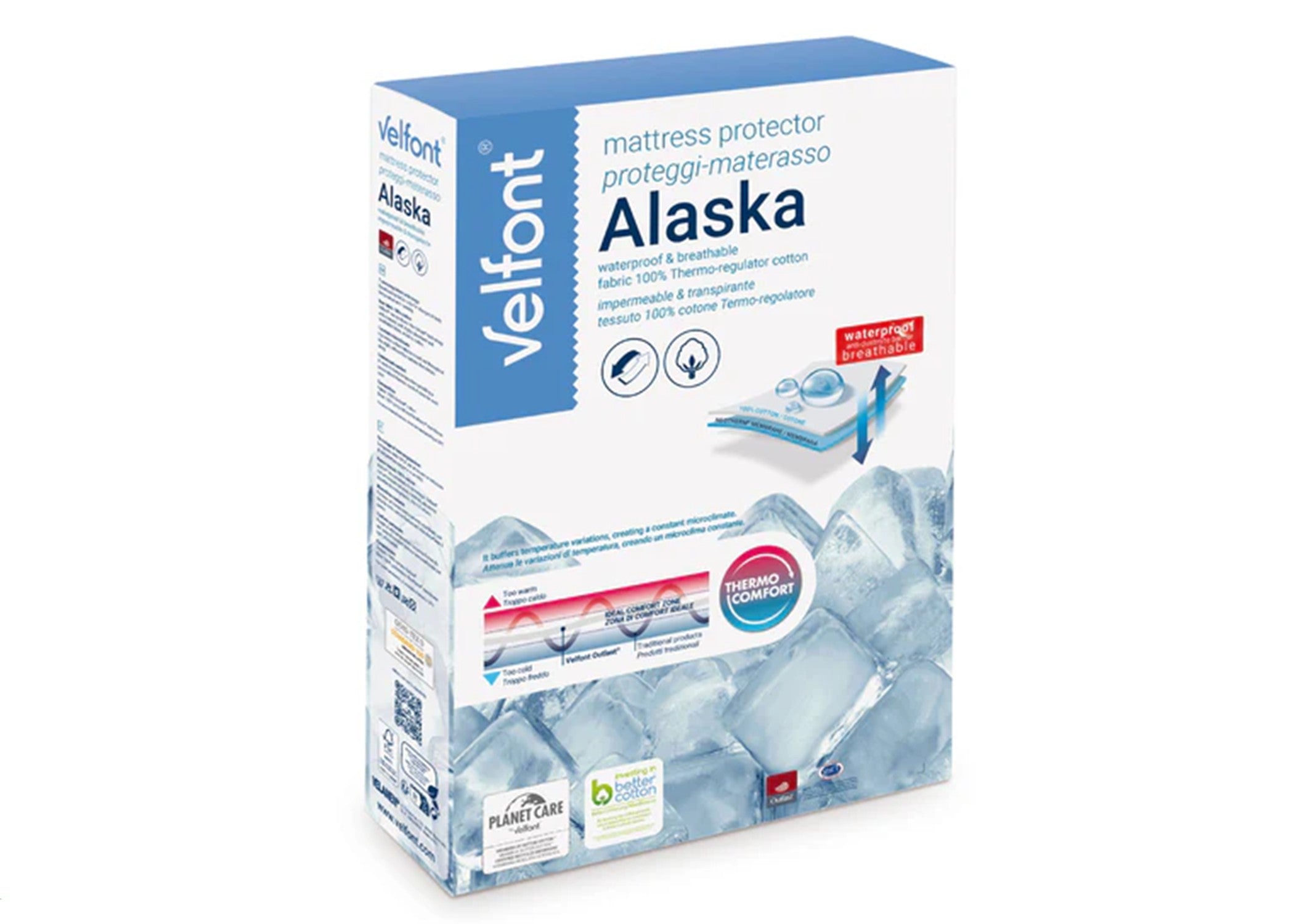 The Alaska thermo-regulating waterproof fitted sheet is crafted from 100% thermo-regulating cotton fabric. It features a top layer made from this innovative material, developed with advanced NASA technology, combined with a super soft 100% cotton bottom layer. The thermo-regulating fabric acts as a buffer against temperature and humidity fluctuations, creating a consistent microclimate for optimal sleep comfort throughout the night.