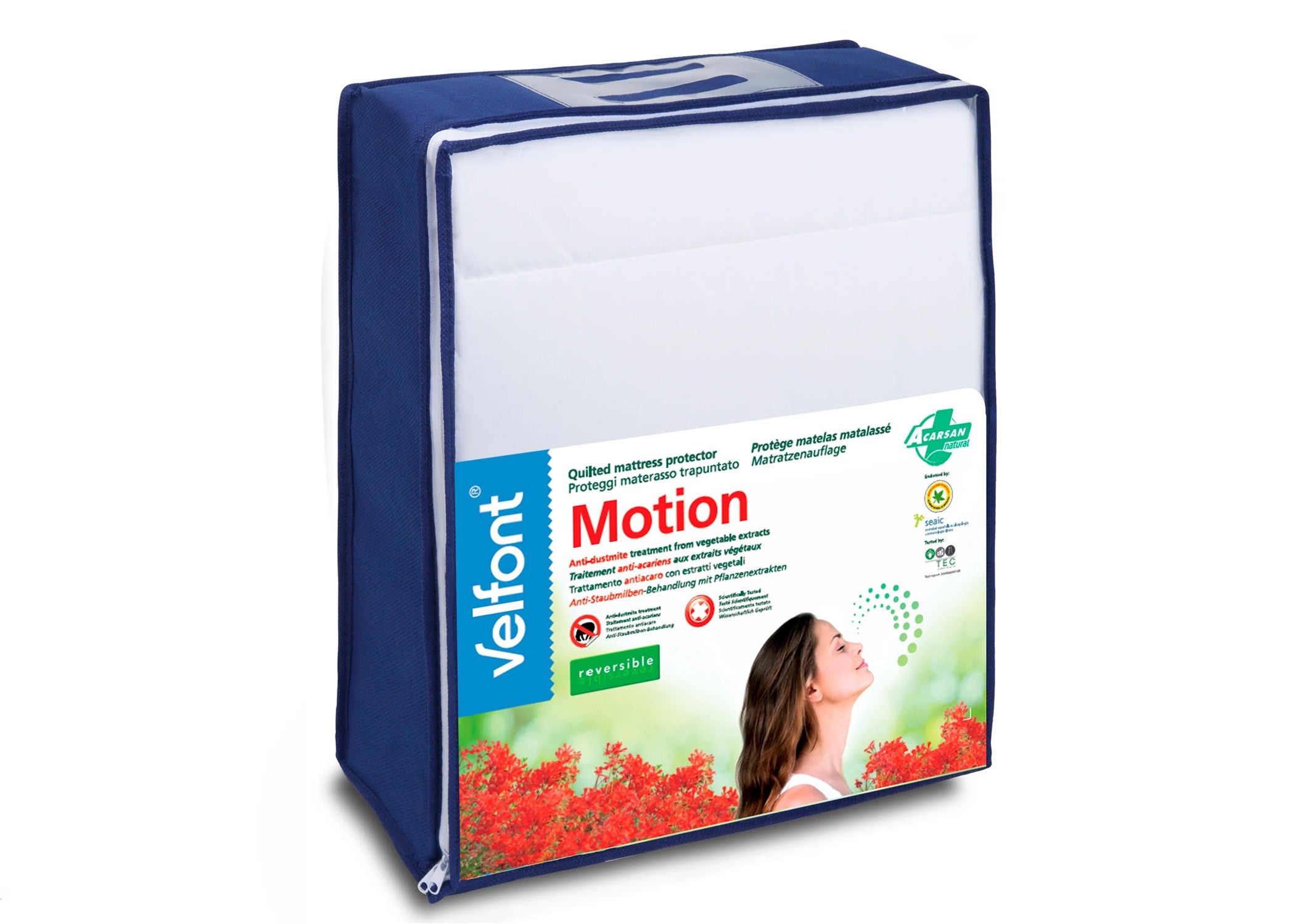 The Velfont Motion quilted mattress protector is a versatile and effective bedding accessory. It is made of 100% extra soft microfiber fabric on one side and 100% natural and highly absorbent cotton terry on the other, allowing reversible use. The quilted filling contains hollow conjugated fiber with Acarsan Natural anti-dust mite treatment from plant extracts, scientifically tested for wash-resistant efficacy. It fits mattresses up to 200 cm in length and 30 cm in height.