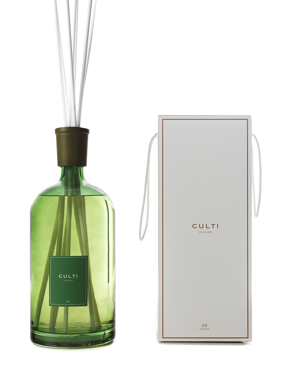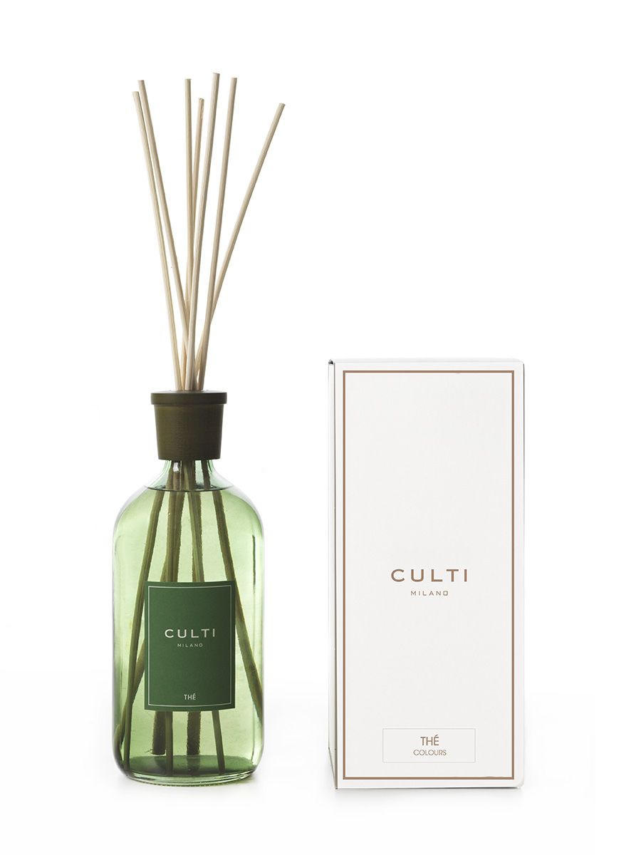 The CULTI COLOURS line presents clear glass bottles with colored labels and Green maple wood caps, adding vibrant energy to any space. Thé, a fragrance within this line, captures the tranquil essence of Japanese green tea, evoking the meditative atmosphere of a bath filled with its aromatic vapors, creating a serene ambiance.