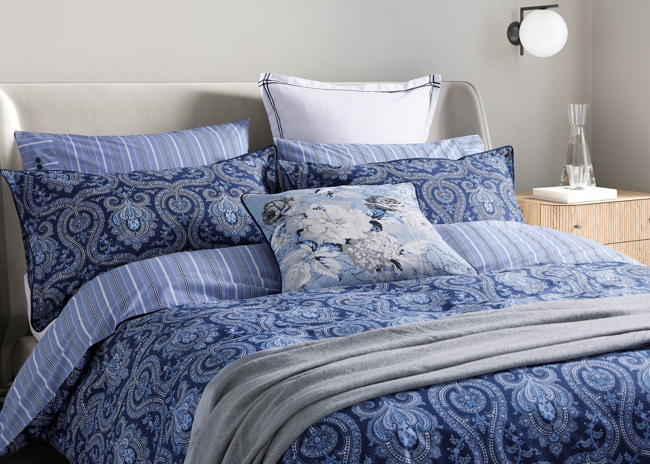 Ellis features an ornate paisley design in rich navy tones, creating an elegant and timeless look. The reverse showcases a sophisticated stripe pattern for versatile styling. Made from 100% BCI Cotton Percale with... Read more