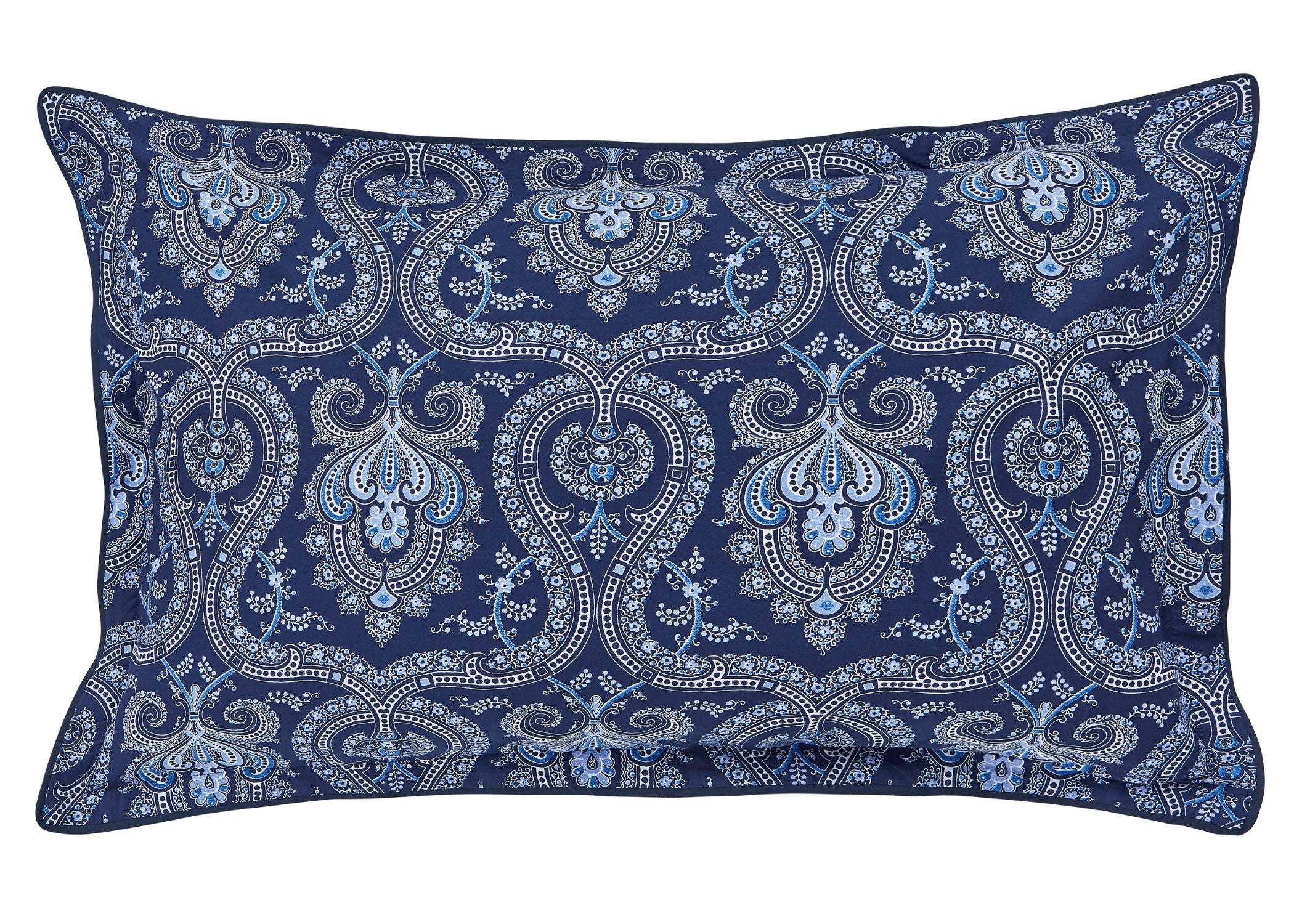 Ellis features an ornate paisley design in rich navy tones, creating an elegant and timeless look. The reverse showcases a sophisticated stripe pattern for versatile styling. Made from 100% BCI Cotton Percale with a 200 thread count, Ellis offers a crisp, smooth, and comfortable feel for everyday luxury.