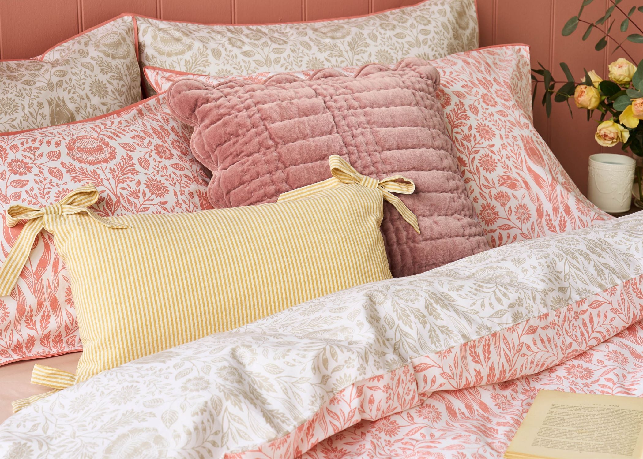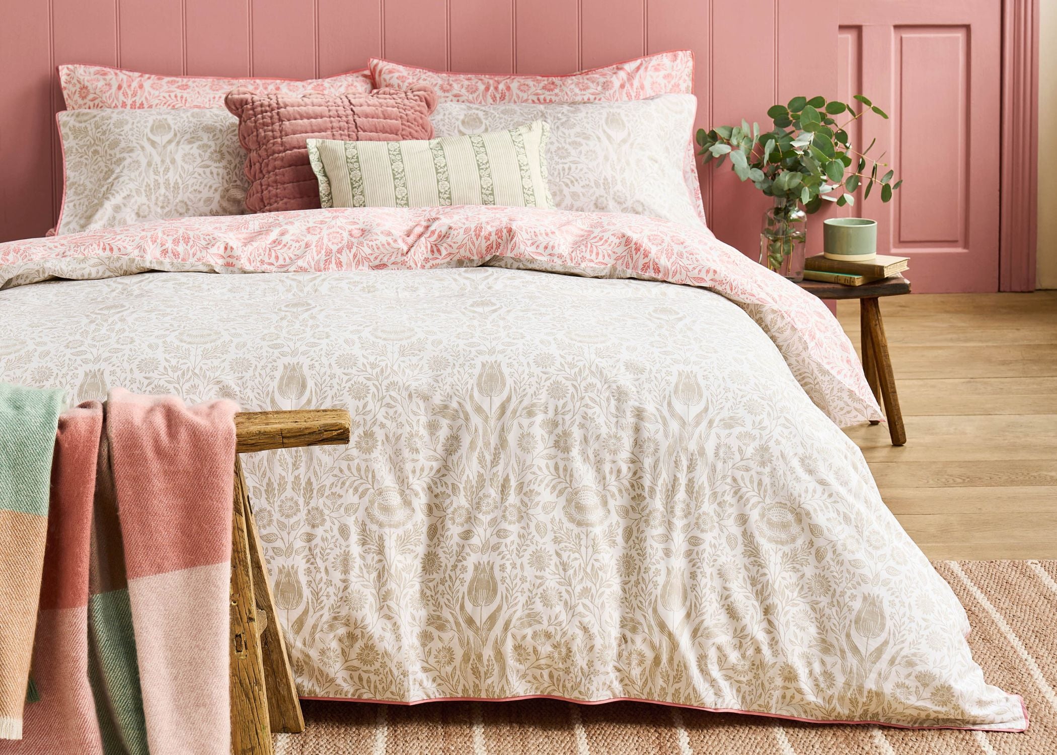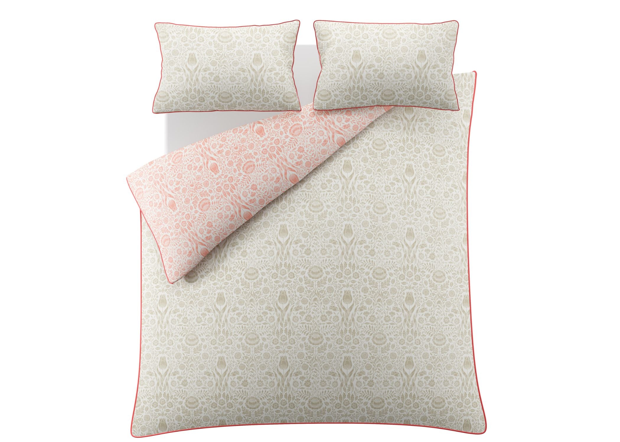 Add natural charm to your bedroom with the Ashstead Damask Bedding Set from Laura Ashley. Inspired by traditional block printing, this elegant design features tulips and garden florals woven with delicate foliage. The reversible design offers two looks in one calming natural tones on one side and soft coral pink on the other.