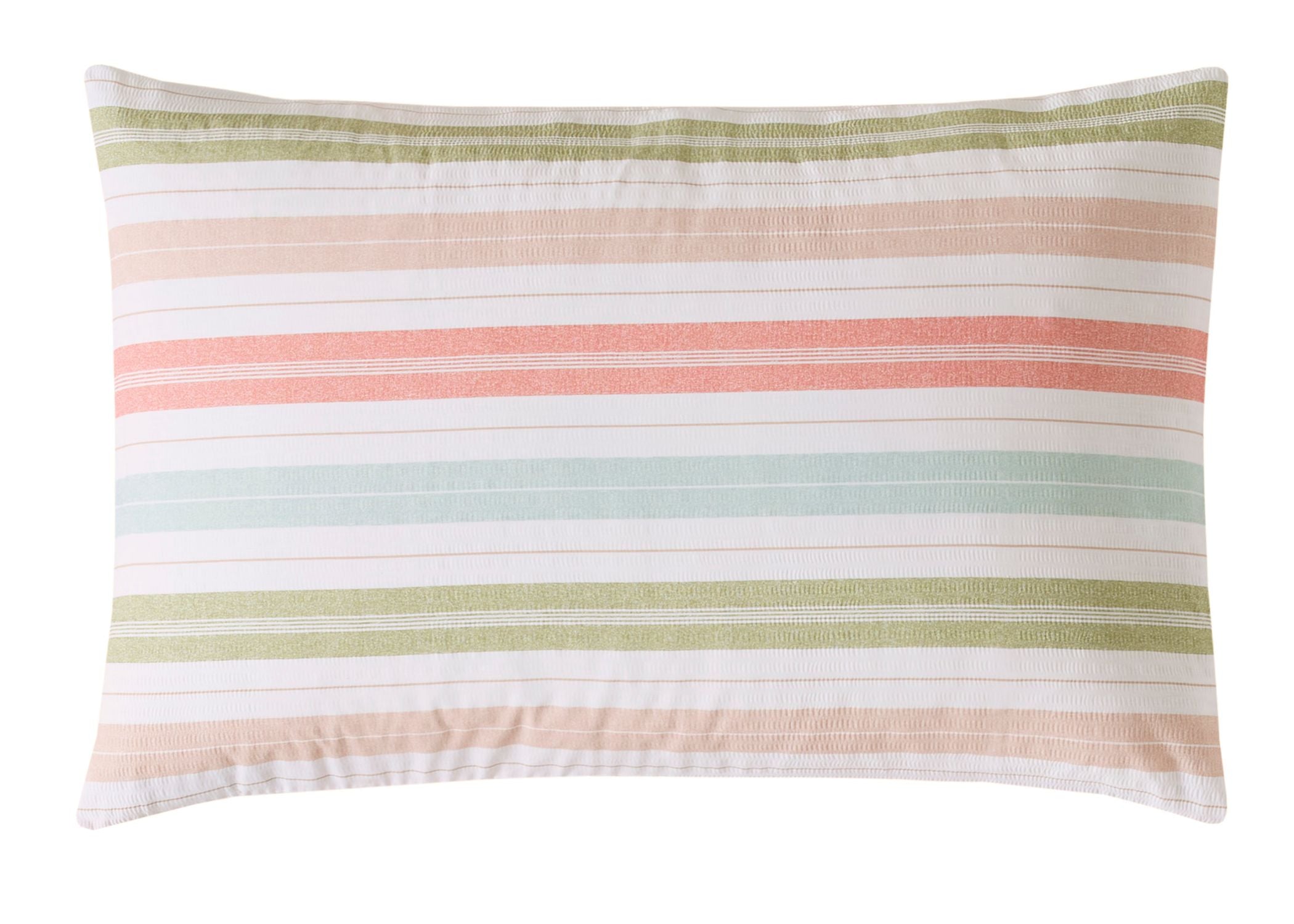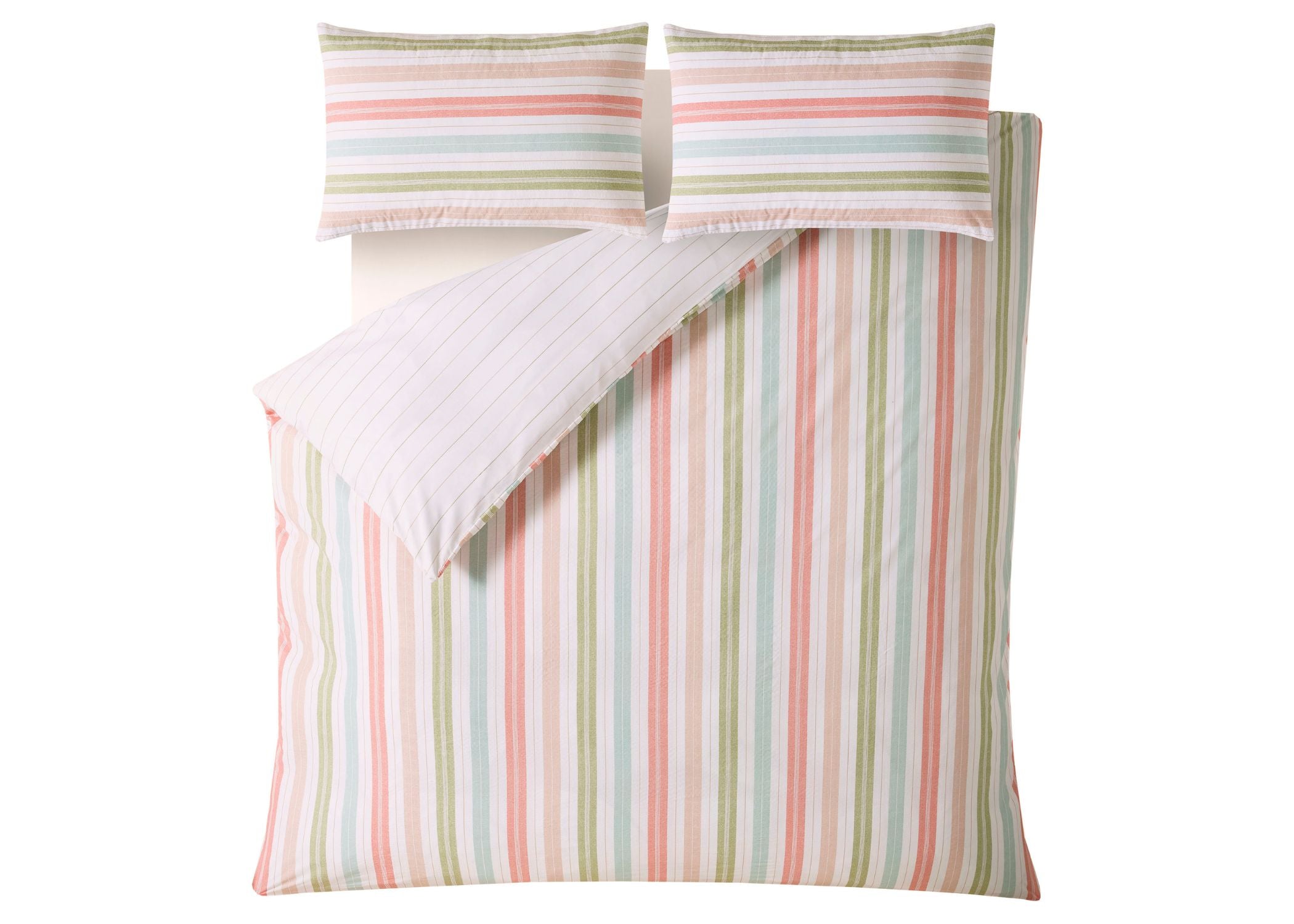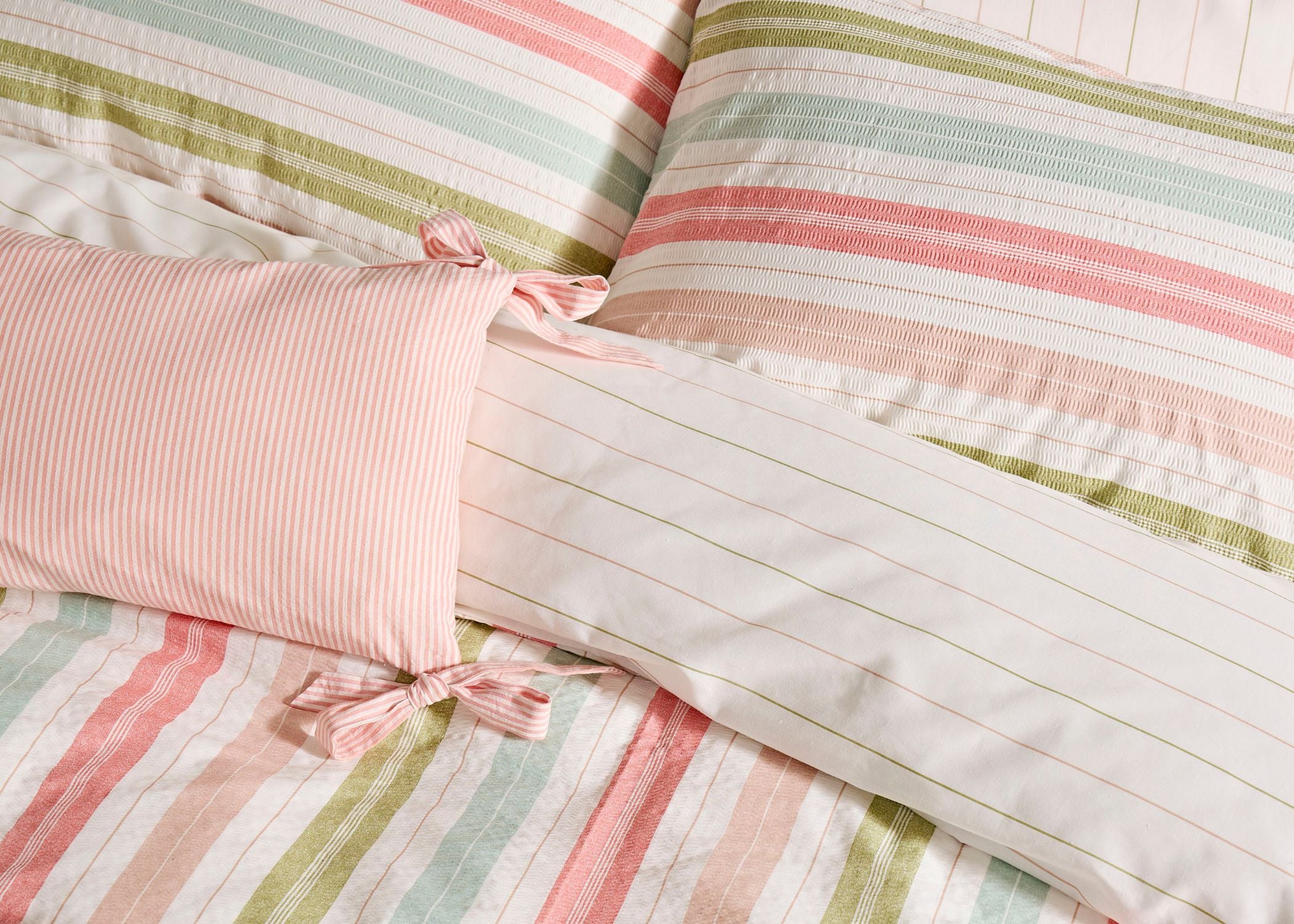 Introducing the Sophie Stripe Bedding Set, taken from the Laura Ashley archive. This striking design features vertical stripes recoloured in a playful palette of summertime tones. Printed on a lightweight seersucker cotton base, the fabric’s signature puckered texture and crinkled finish add casual elegance while offering an easy-care, iron-free finish perfect for effortless everyday living.