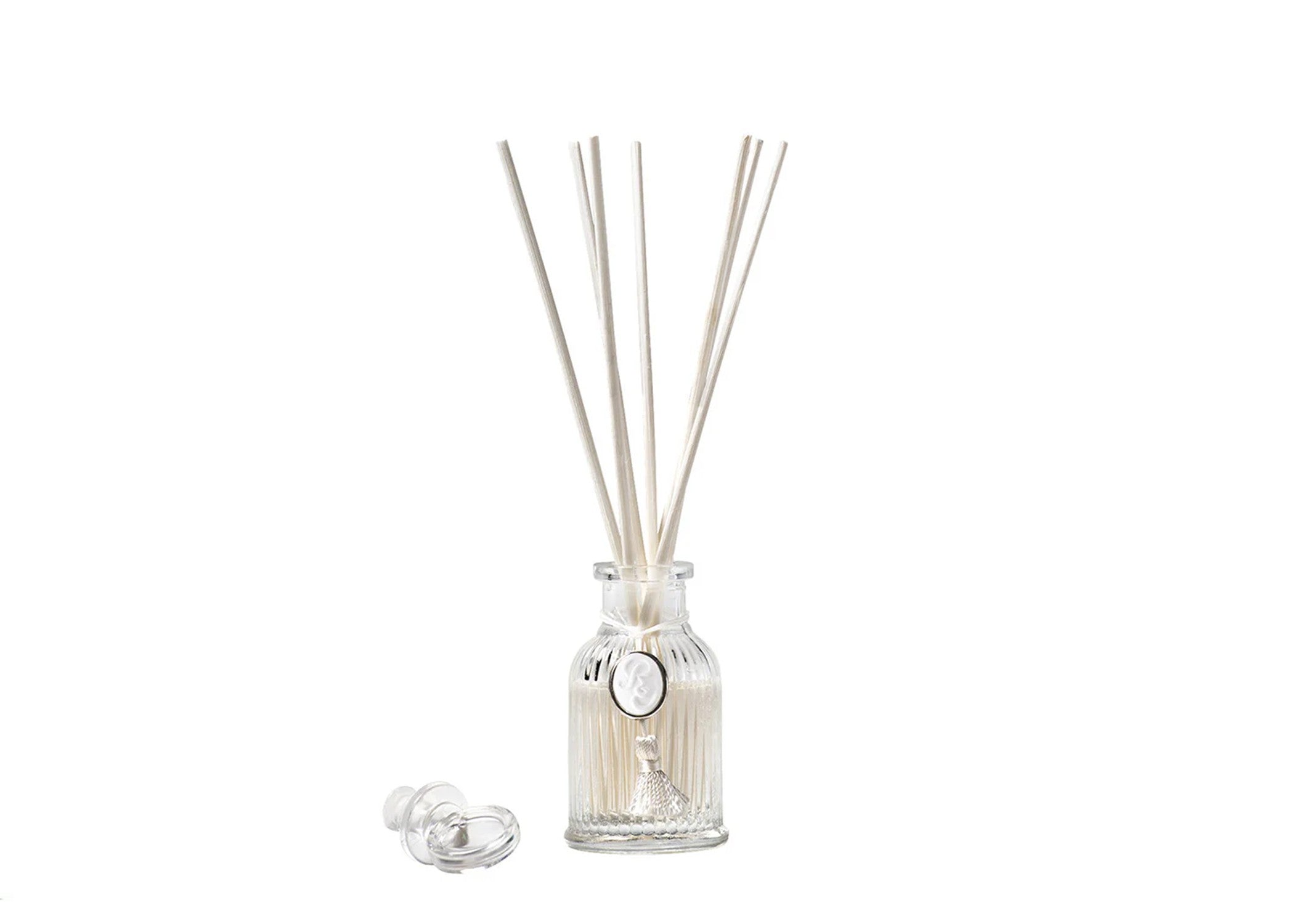 Mathilde M. home fragrance diffuser is a refined decorative item that consistently scents your living space with the captivating fragrance of Rose Élixir. This fragrance combines the regal rose with powdery violet notes, resting on a base of white musks. The diffuser utilizes natural rattan stems to release the fragrance gradually over several weeks and includes a glass stopper for convenient control of diffusion.