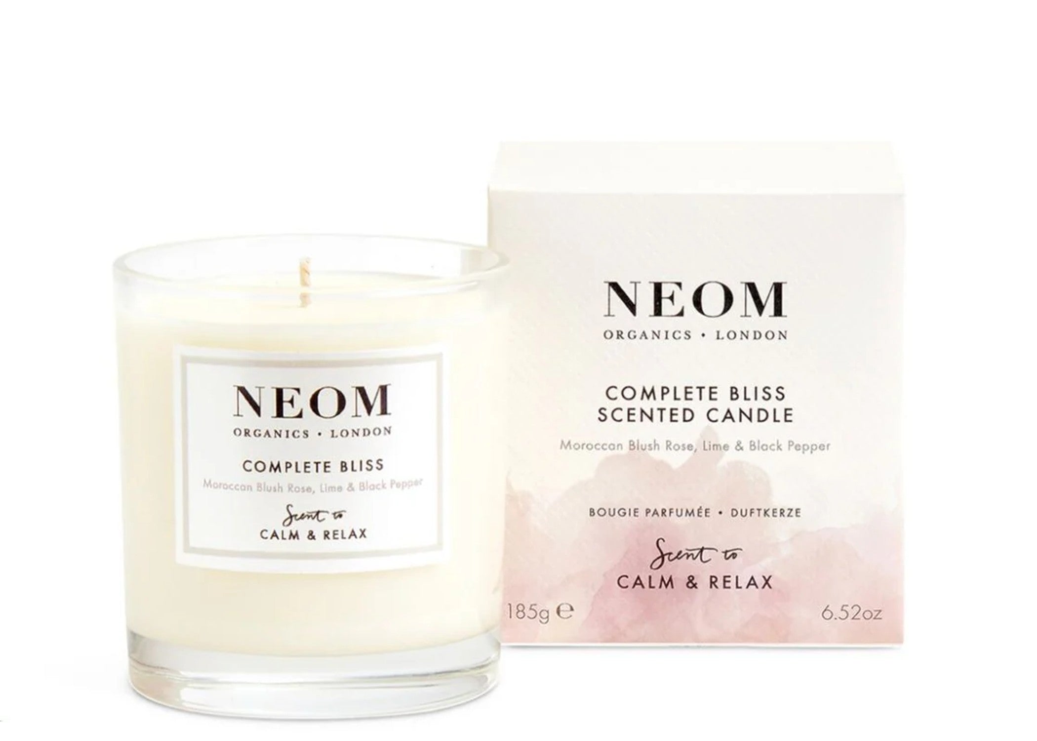 Neom Complete Bliss contains 17 essential oils, including Moroccan blush rose, lime, and black pepper, all chosen to ease tension and calm the body and mind.