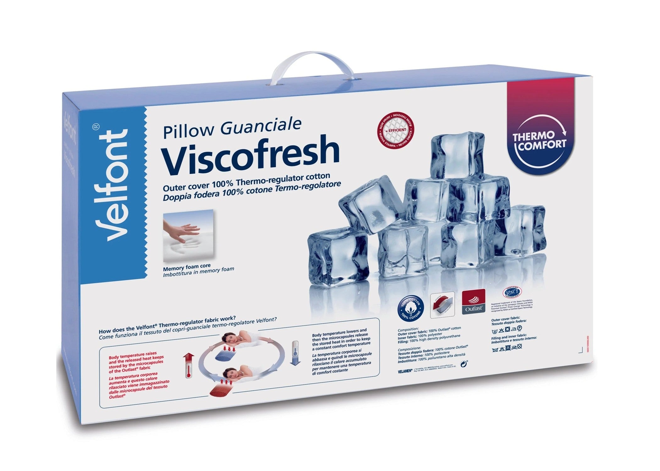 Velfont "Viscofresh" viscoelastic pillow is made with a high-density viscoelastic core of medium-low firmness and a double cover of 100% cotton thermo-regulating fabric, with NASA-developed technology applied to cotton fabric, resulting in an exclusive and unique product. A thermo-regulating fabric absorbs, stores, and releases the heat we release, creating an individualized comfort zone. A constant microclimate is maintained, neither too cold nor too hot.