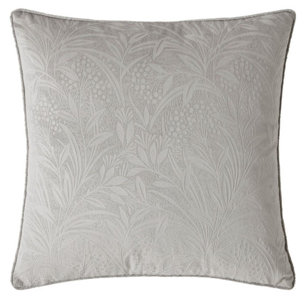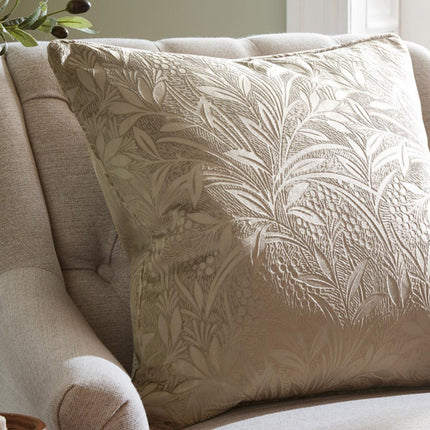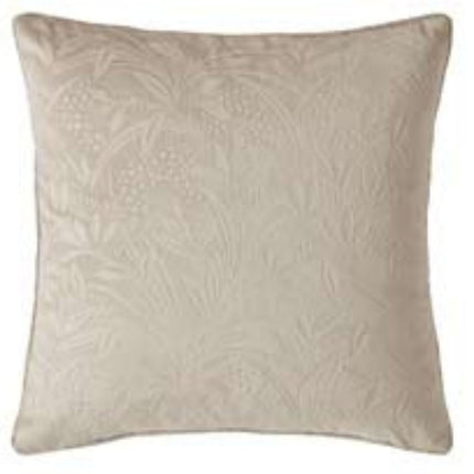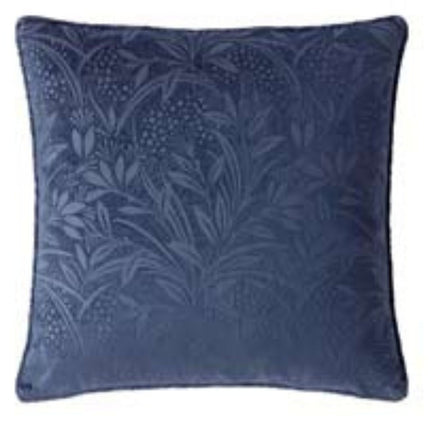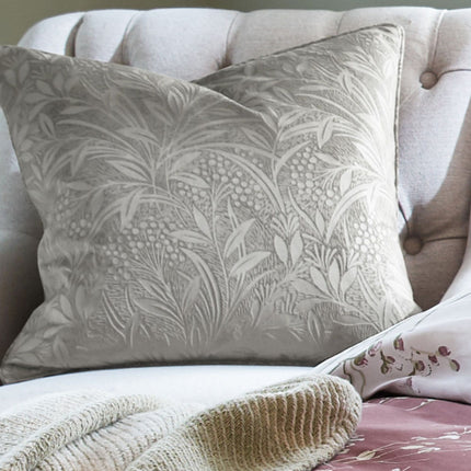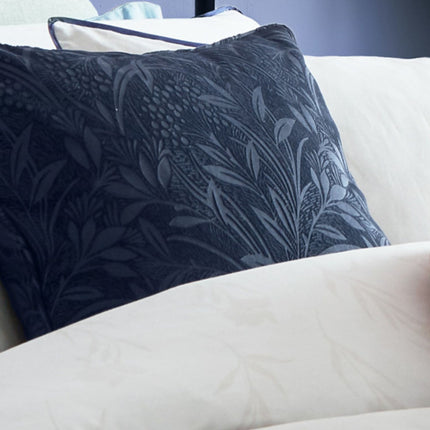 A beautifully embossed velvet cushion featuring delicate sprigs, leaves, and foliage on a soft velvet base. Finished with smart, velvet piping detail. Choose from a strong colour palette of Midnight navy, Natural and Steel Grey.