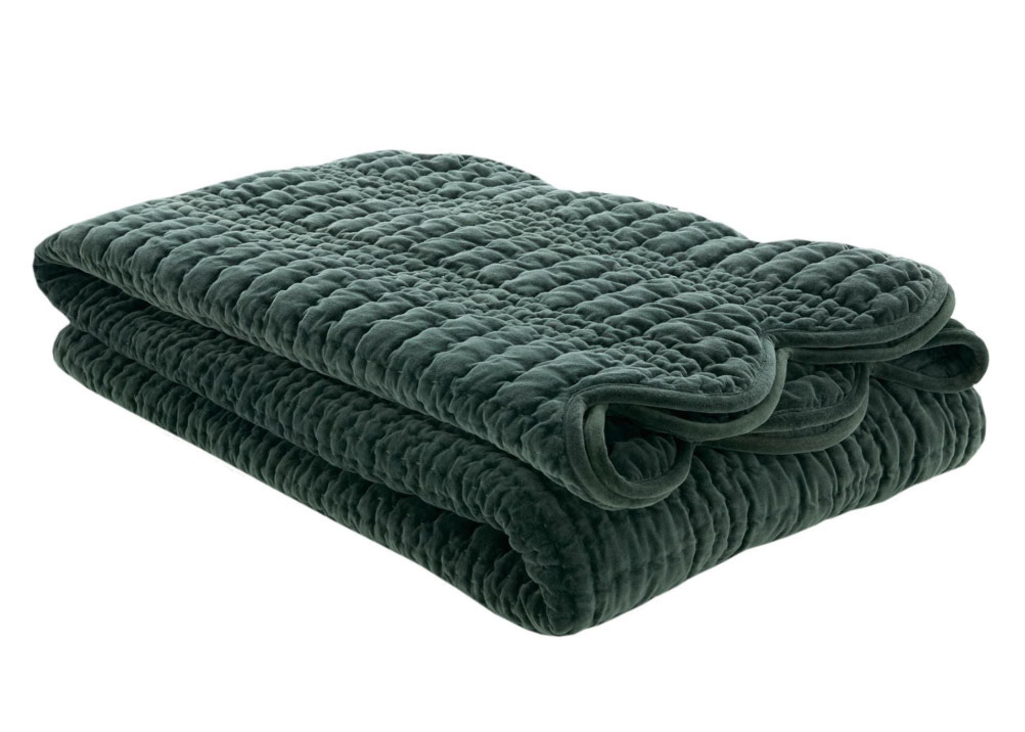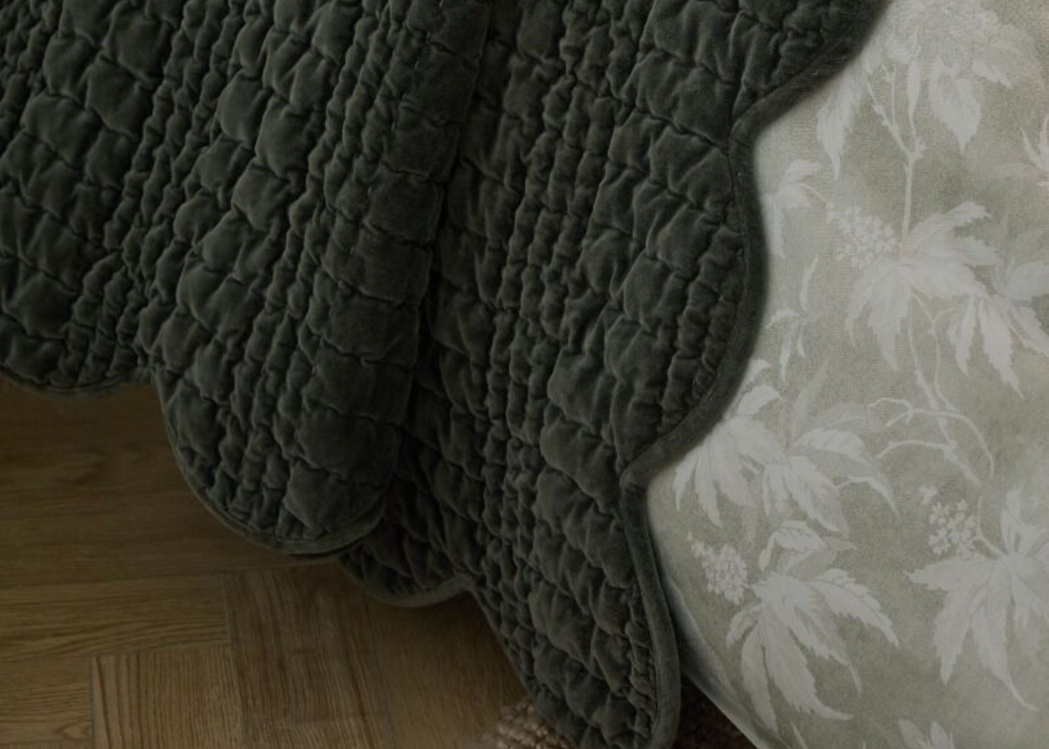 Delicate scalloped edges and hand stitching create a refined, flowing silhouette that drapes gracefully around the bed. Available in a rich deep olive shade, this bedspread is perfect for creating a cosy and stylish atmosphere while adding a statement layer of comfort.