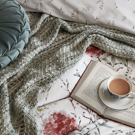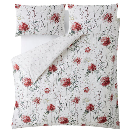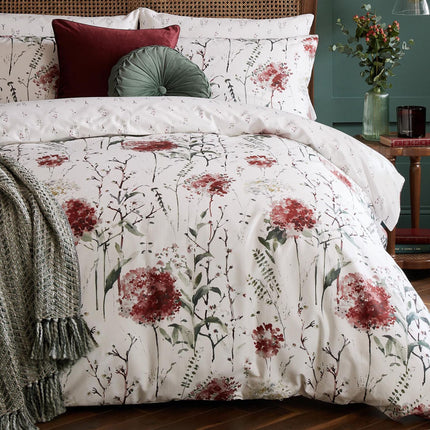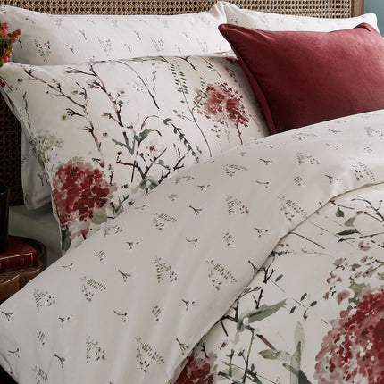 Sophisticated and contemporary, the Pallington Bloom duvet cover set features delicate alliums and blossom branches in a watercolour style in a classic ruby red, cream and sage green palette, on a luxurious 220TC cotton sateen bedding. Delicate, painterly sprigs and leaves decorate the bedding reverse.