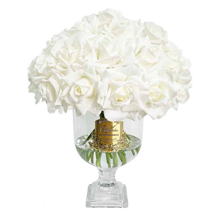 Bring timeless French elegance into your space with the Versailles French Rose Bouquet. This stunning arrangement features 31 hand-crafted, life-like roses, set in clear gel to mimic fresh-cut flowers in water. Each petal has a special coating for a natural touch and realistic look.  Arranged in a luxury vase, the bouquet is gently perfumed by hand and expertly crafted from start to finish by floral artisans. Made in Portugal